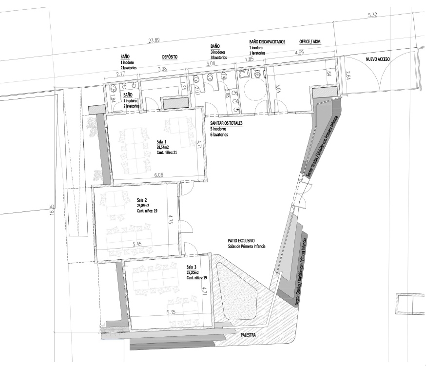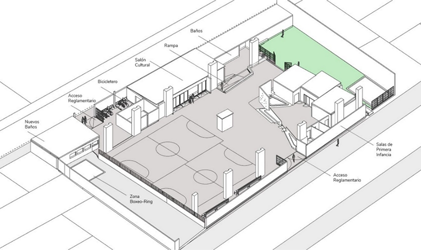Proyecto de Espacio Cultural y Espacios de Primera Infancia dentro de Club Flores Sur, Ciudad de Buenos Aires. En colaboración con Arq. Graciela Elsztein Año: 2020